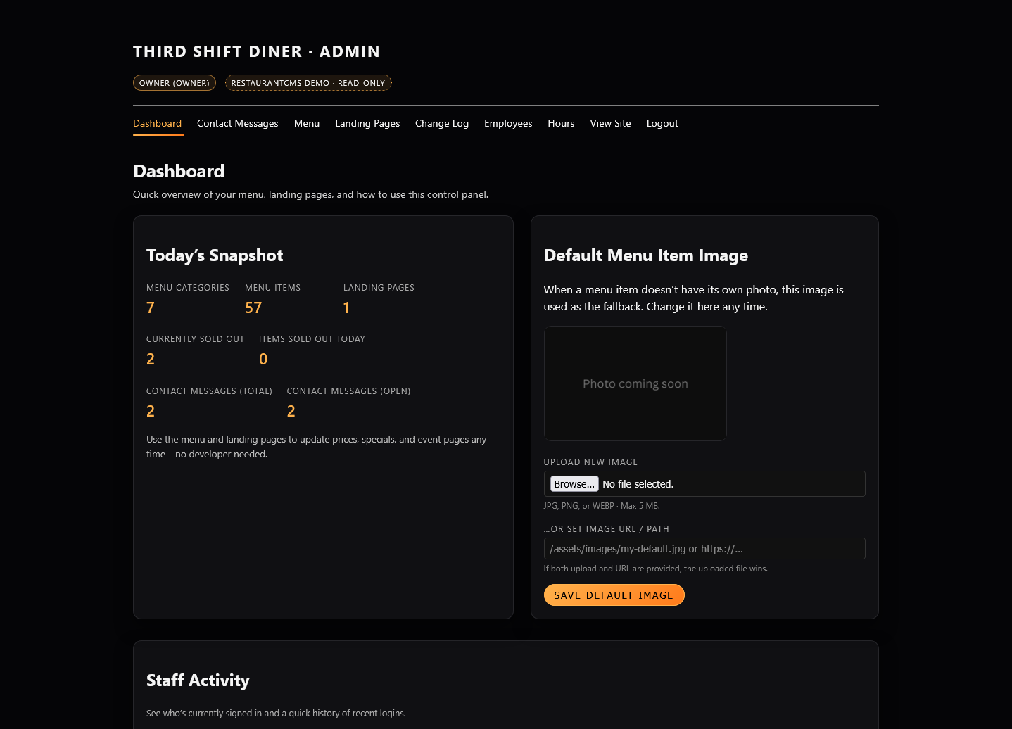 RestaurantCMS is a small, purpose-built content system for that job. It powers this fictional late-night spot, Third Shift Diner, and is designed to drop into your existing domain with minimal fuss.